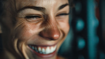 Close-up portrait of a smiling woman. Captures genuine happiness, healthy skin, and a positive emotion.