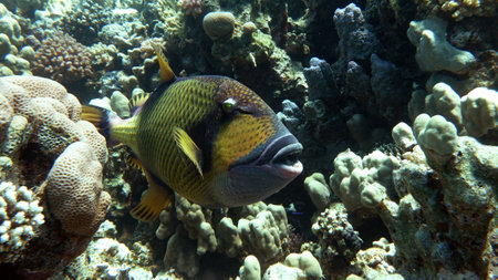 large titan triggerfish swimming and looking to the camera while diving in the red sea