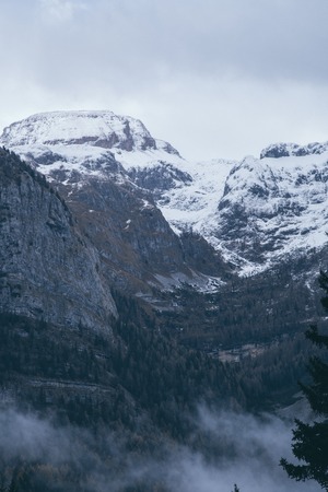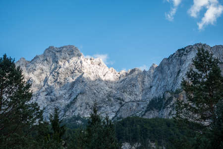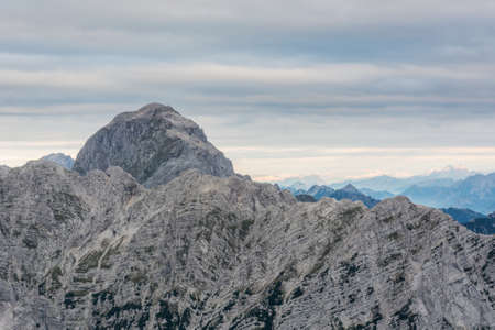 View of the Bavarian Alps. The mountain range is called Krawendel and is located near Mittenwald, Germany. Bad mountain weather outdoor concept.