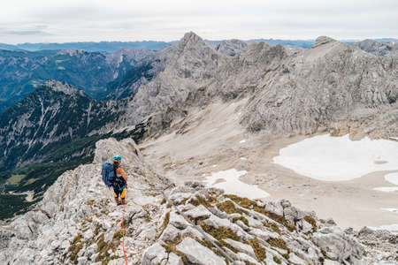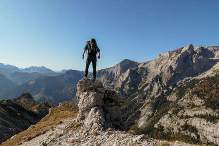 A man standing on top of a sharp, pointy boulder in Hochschwab region, Austrian Alps. The steep mountain wall in front look very dangerous. High mountaineering. Autumn vibes. Adventure and freedom