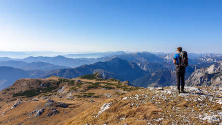 A man with backpack hiking in Hochschwab region in Austrian Alps. The flora overgrowing slopes is golden. Autumn vibes in the mountains. Endless mountain chains shrouded in fog. Freedom and wilderness