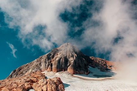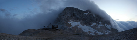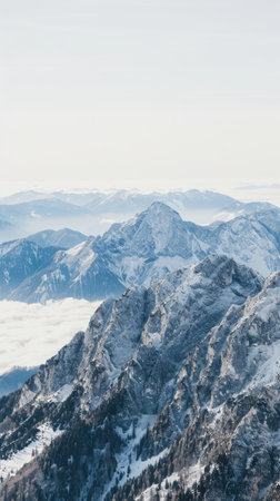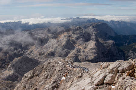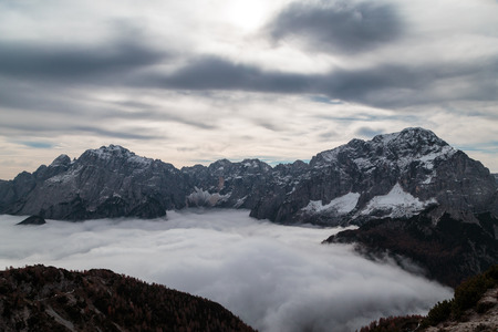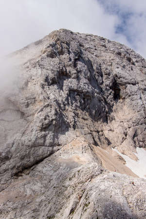 A closeup of a mountain peak covered with fog and snow in the Julian Alps, Slovenia