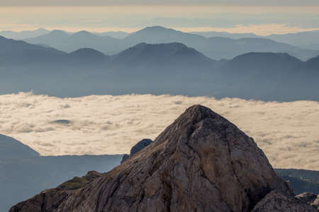 Early morning viewed from Triglav, the highest mountain in Slovenia just at dawn. Visible sun rising and shining above the valleys and mountain ranges in front