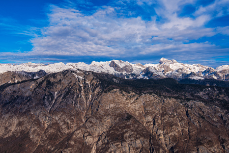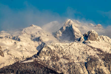 Triglav mountain above Bohinj lake valley in winter time, beautiful landscape of a part of Julian Alps mountain range and national park in Slovenia Europe