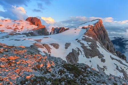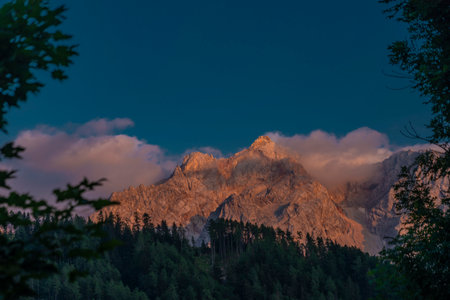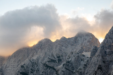 Triglav mountain peak at sunrise with beautiful clouds in morning light. Slovenia, Triglav National Park