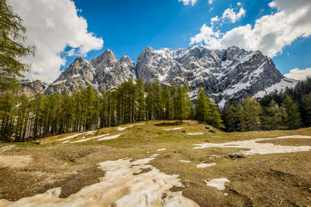 Scenic view of snow capped mountain peaks of Karawanks on the way to Sinacher Gupf in Carinthia, Austria. Mount Wertatscha is visible through dense forest in early spring. Rosental on a sunny day.Hike