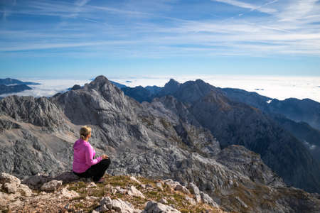 Female hiker sitting and relaxing on a mountain and enjoying beautiful view.