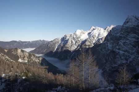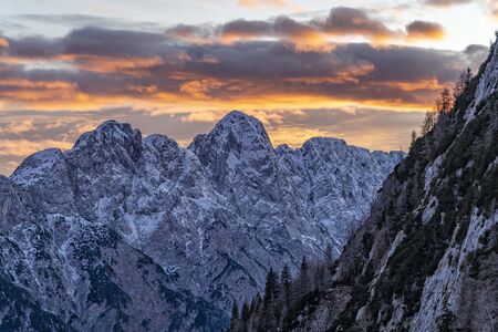 Sunset in the mountains between Slovenia and Italy in a freezing winter day
