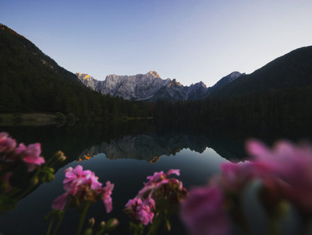 Alpine mountain lake landscape flower panorama reflection at Laghi di Fusine Weissenfelser See in Dolomites alps Italy
