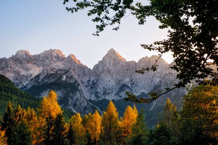 Landscape view of mountain peaks and colorful autumn foliage, Triglav national park, Slovenia, Europe