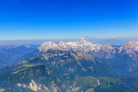The Dachstein summit mountain range and visible glacier ice during summertime at Gosau, Upper-Austria, Europe