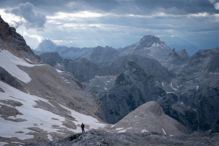 Man standing in front of beautiful alpine landscape with mountains and ridges during sunset,Slovenia