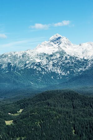 Beautiful view of snow covered Mount Triglav, the highest peak in Slovenian Julian Alps, from a distance on a bright sunny day, with hills and forest slopes in foreground