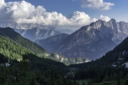 Scenic view through the forest on the summit Jezerska Kocna in Kamnik Savinja Alps in Carinthia, border Austria and Slovenia. Mountain peaks in the Vellacher Kotschna. Mountaineering. Freedom concept