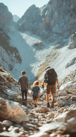 A family hikes together along a rocky mountain path, exploring the stunning landscape. Surrounded by nature, they share laughter and memorable moments in the great outdoors.