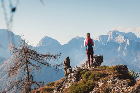 View from the back woman hiker looking at the view of surrounding mountains while on an autumn hike in the Alps