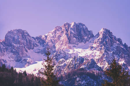 Early morning view on snow capped mountain peaks of Karawanks in Carinthia, Austria. Julian Alps. Scenic view on winter wonderland in the Austrian Alps, Europe. Ski tour, snow shoe hiking. Grintovec