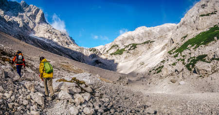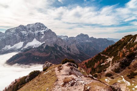 mountain path and view on the peaks at sunset. Panoramic landscape on Kranjska Gora