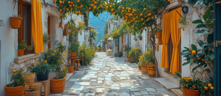 Bright bougainvillea cascades over whitewashed walls in a quaint village. Sunlight reflects off cobblestone paths lined with terracotta pots, creating a peaceful atmosphere.