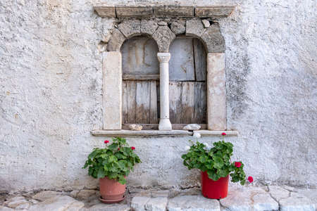 Greece, Cyclades. Folegandros island. Windows with carved marble frame, old church at Chora town square. Traditional Cycladic chapel, whitewashed wall