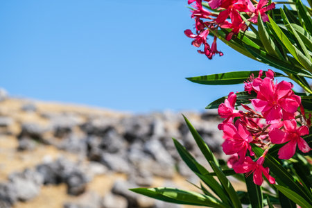 pamukkale, Turkiye, 07/08/2025 Bright pink oleander flowers blooming against a clear blue sky. Summer garden flora background with copy space.