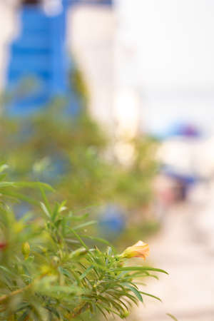 White oleander flowers and leaves closeup, Cobblestone pedestrian street and cafe background. Chania old town, Greece. Crete island,