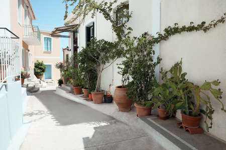 Greek specific - Picturesque narrow street with bougainvillea flowers