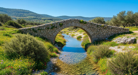Generative AI : Beautiful romantic image of cobbled streets and ancient walls overgrown with green bushes and bright oleander flowers on bright sunny summer day on territory of for
