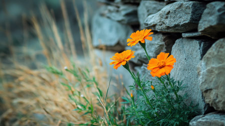 A beautiful arrangement of vibrant orange flowers grows beside a rustic stone wall, surrounded by dry grass, creating a peaceful and colorful outdoor scene.