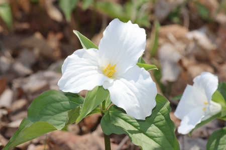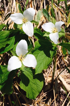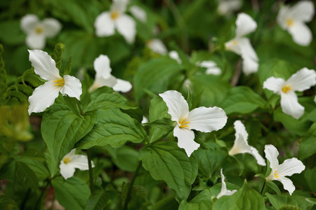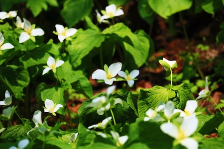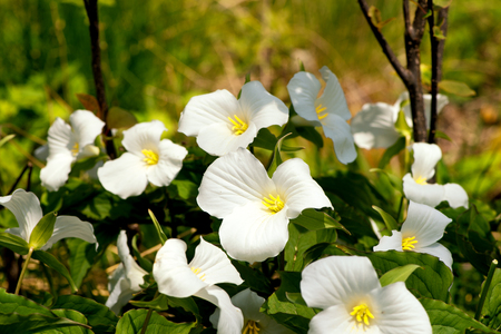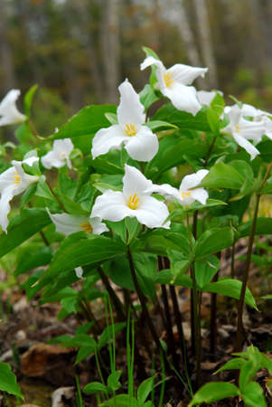 Pretty White Trilliums grandiflorum near the edge of a tree filled forest in SE Ontario. Provincial flower of Ontario