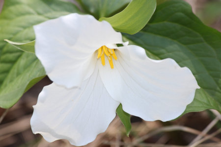 The white, large-flowered, great white trillium or white wake-robin (Frillium grandiflorum) flowering with a single, showy white flower atop a whorl of three leaves in the garden in spring