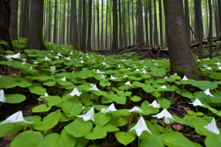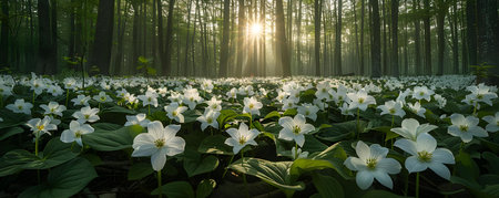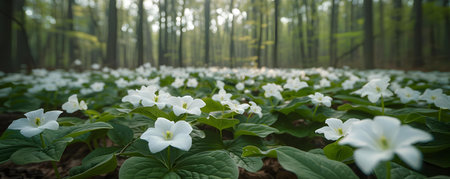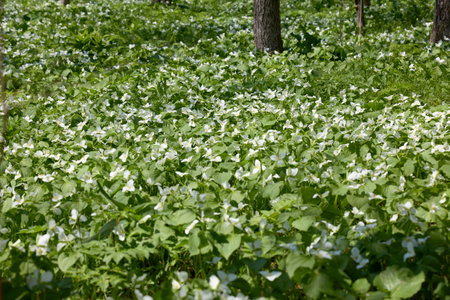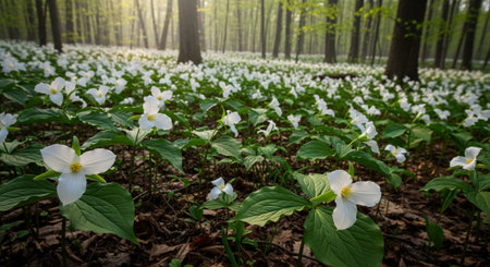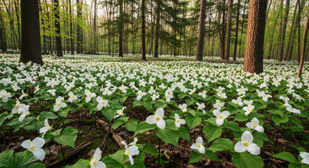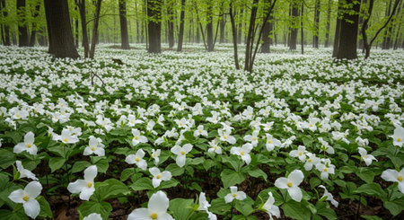 Forest floor covered in white trilliums creates a serene scene. Concept Nature Photography, Wildflowers, Serene Landscapes