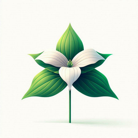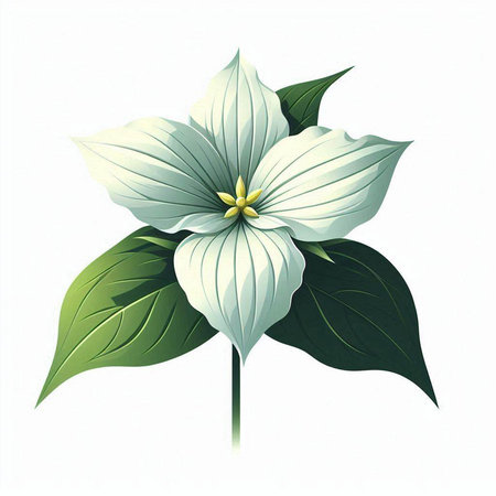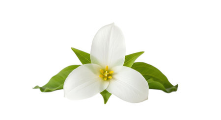 A single, pristine white trillium flower with three petals and green leaves is isolated against a clean white backdrop.