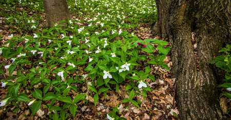 Seasonal Spring Wildflower Nature Background. Spring trillium carpet a northern forest floor. Trillium are protected in the wild and are the official wildflower of Ontario and Ohio