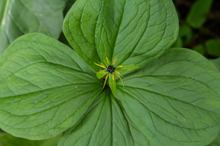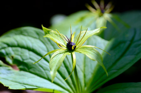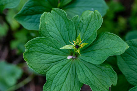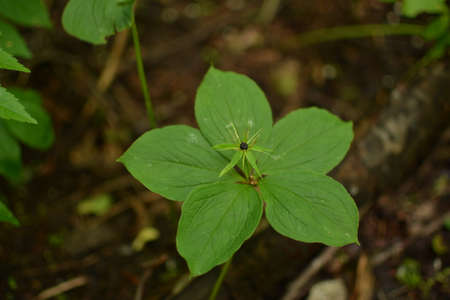 Poisonous plant Ravens eye four leaf. Paris quadrifolia. Close-up of a plant with fruit