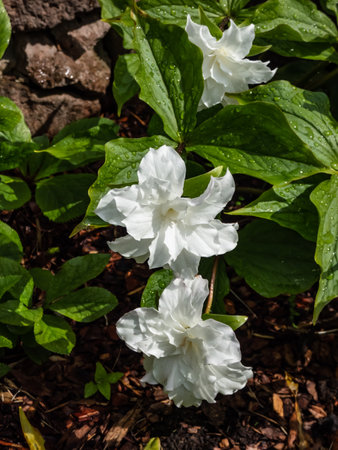 American wake-robin (Trillium grandiflorum) 'Snow bunting' flowering with solitary, brilliant-white, fully double flowers in the garden in summer after rain