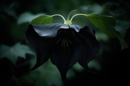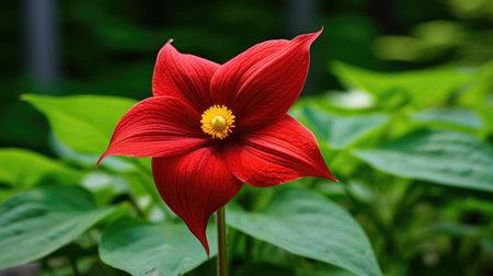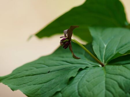 This close up of red trillium Trillium erectum, wake robin, stinking Benjamin shows the fine detail of the petals, stamens and stigma Drops of water on the plant hint that April showers bring May flowers