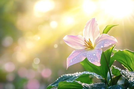 Close-up view of a pink trillium flower with water droplets covering the petals, set against a bright, sun-drenched background and green foliage.
