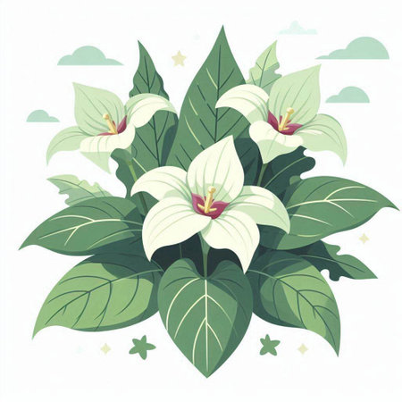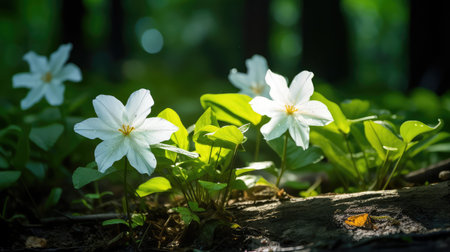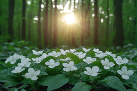 A peaceful garden scene featuring several trillium flowers in full bloom, bathed in soft sunlight. Lush green foliage creates a beautiful contrast against the flowers' delicate white petals, highlighting their purity.