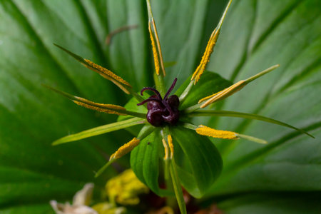 Paris herb. Poisonous berries and flowers grow in the forest.