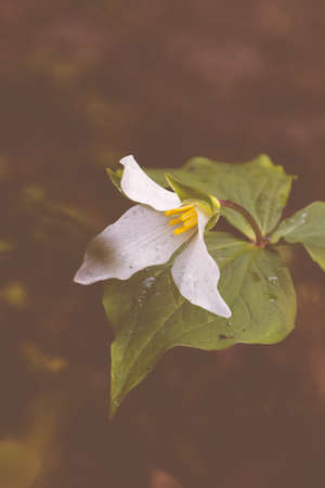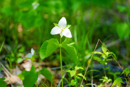 Great white trillium flower in the city park. Selective focus, nobody, blurred, shallow depth of field