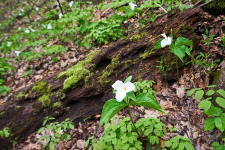 white trilliums against log – a common wildflower growing in moist, humus soil and cover large areas of a forest floor