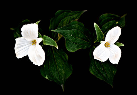 A pair of white Trilliums on a black background. Low key, with high contrast processing. Trillium grandiflorum is the official emblem of the Province of Ontario and the State Wildflower of Ohio.