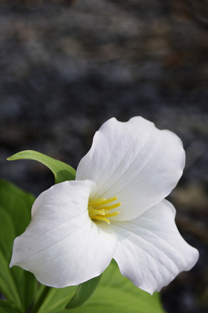 White petals of the large flowered White Trillium (Trillium grandiflorum). Provincial flower of Ontario blooms in a woodland in springtime month of May.