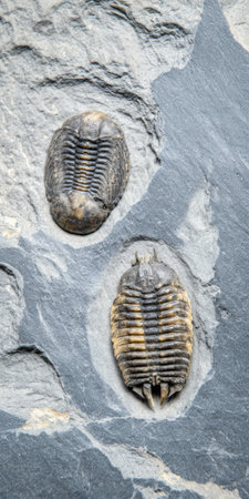 Two ancient trilobite fossils preserving prehistoric life, carefully extracted from a gray stone, showcasing the scientific concept of paleontology, evolution, and extinct species