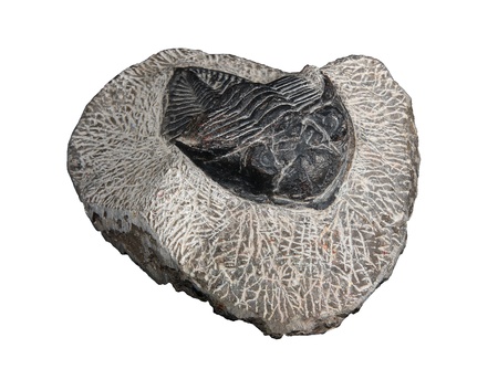 Imprint fossilized animal trilobite in stone isolated on white