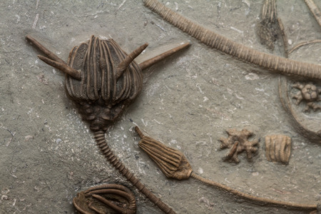 Fossil fossil on the ground. Retro style. Selective focus.
