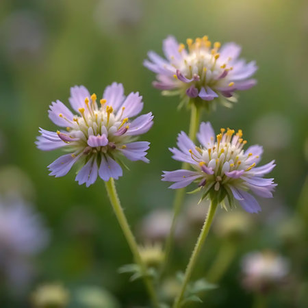Three soft purple wildflowers bathed in gentle sunlight create a peaceful scene Perfect for nature blogs and websites.