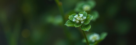 Beautiful meadow with blooming Stellaria media or chickweed white small flowers and green grass. spring nature background.