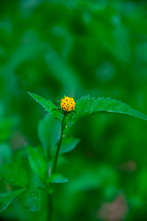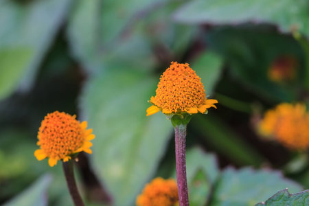 Tridax procumbens yellow flowers in focus with green leaves all around